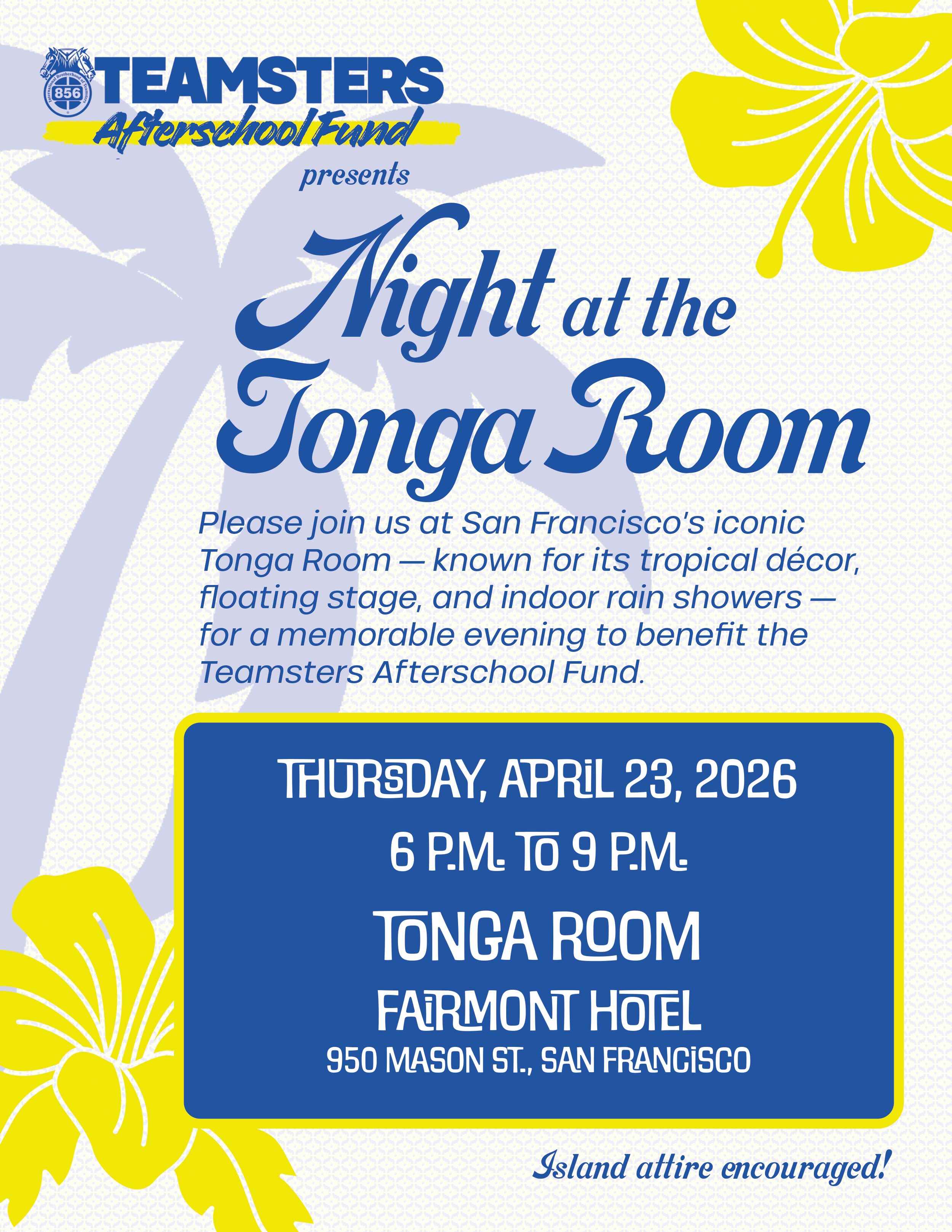 Please join us at San Francisco’s iconic Tonga Room — known for its tropical décor, floating stage, and indoor rain showers — for a memorable evening to benefit the Teamsters Afterschool Fund.